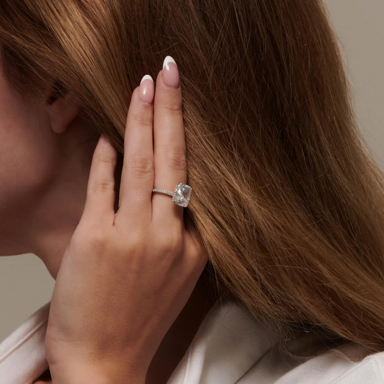 Classic Radiant Cut diamond simulant stone set on a half eternity band decorated with pave brilliant cut stones.