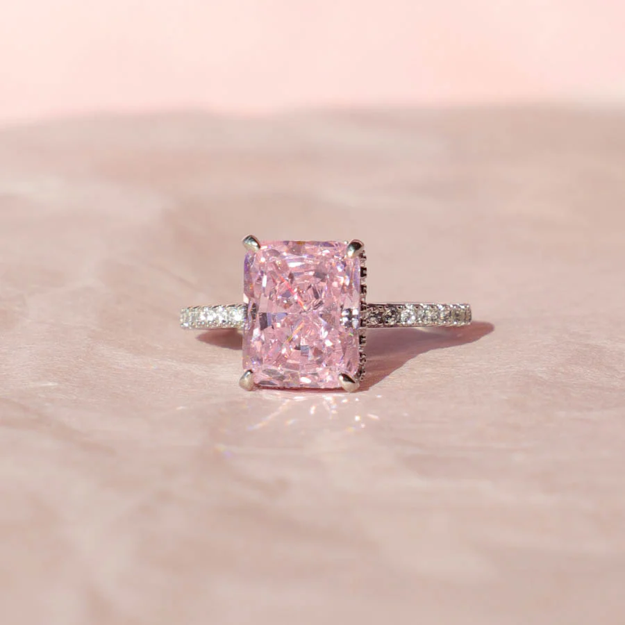 Sterling Silver ring created with an impressive hand-cut pink sapphire simulant in Crushed Ice Cut. Our Brea Ring is an excellent choice for those looking for jewellery that makes an impact.
