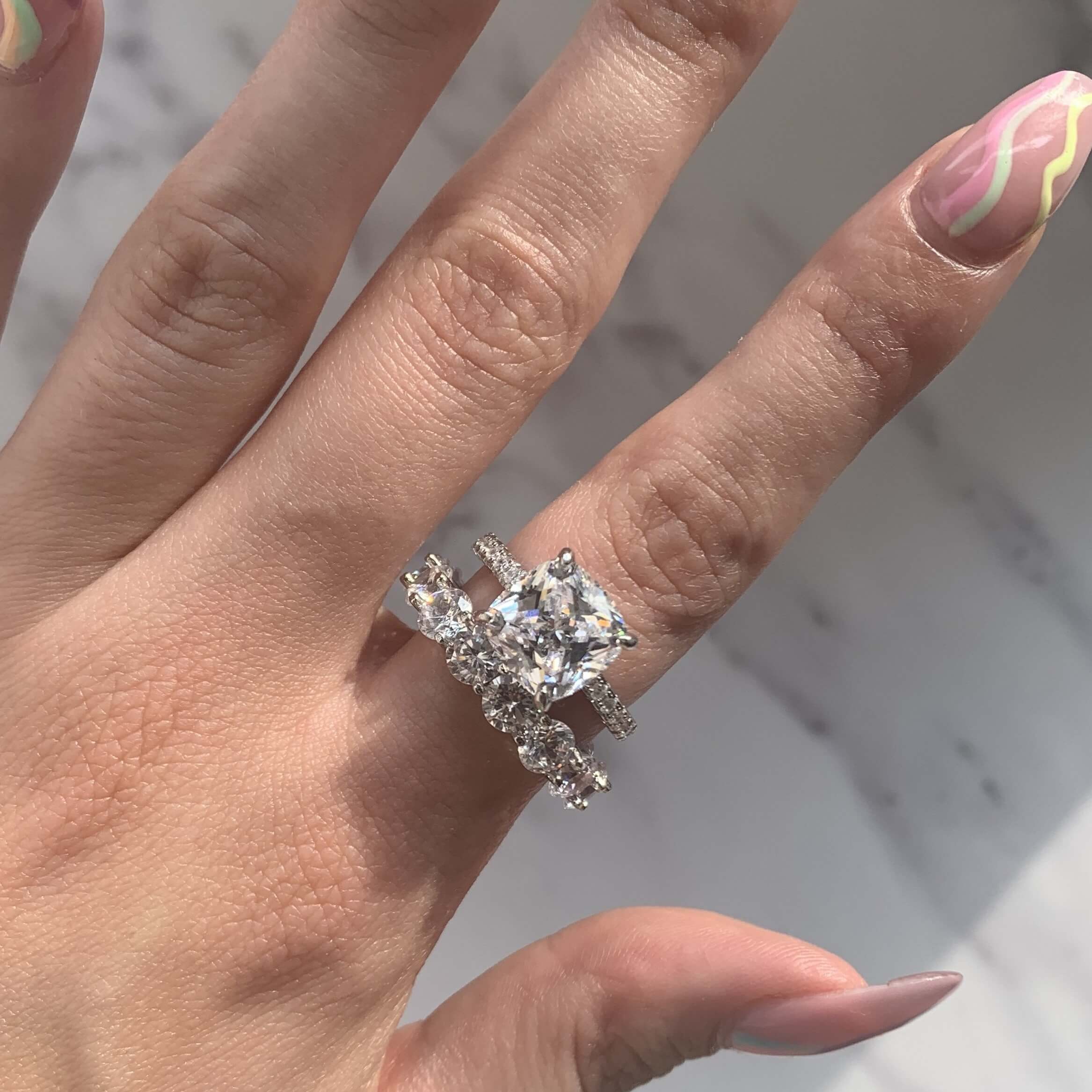 Our Mila Ring is a gorgeous 5 Carat Cushion Shape Crushed Ice Cut stone in a beautifully decorated setting. Don't let Mila's Carats intimidate you, as the perfectly proportioned band ensures optimal balance and versatility. Totally stackable!